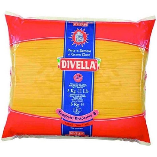 Divella Spaghetti Ristorante 8 — это премиальная итальянская паста в форме классических спагетти, изготовленная из отборной семолины твёрдых сортов пшеницы. Разработана для ресторанного использования, обладает идеальной гладкой текстурой и насыщенным вкусом, который гармонично сочетается с любыми соусами — от простого оливкового масла с чесноком до сложных мясных рагу или трюфельных кремов. Формат 5 кг предназначен для профессиональных кухонь, кейтеринга или больших семей, позволяя приготовить множество порций без потери качества. Произведено по технологии медленной сушки "Lenta Lavorazione", обеспечивающей аутентичную консистенцию al dente и сохранение всех питательных веществ. Без ГМО и искусственных добавок, подходит для вегетарианцев.