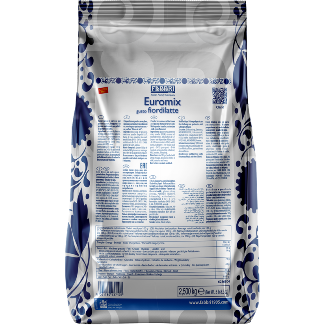 Это профессиональная основа Fabbri Fiordilatte в удобной упаковке 2,5 кг — продукт класса specialty, разработанный для системных применений в сегме horeca и e-commerce. Этот порошок обеспечивает насыщенный молочный вкус с характерной сливочной текстурой и лёгкой сладостью, создавая впечатляющую гастрономическую базу для создание мягкого фиордилатте-джелато и молочных десертов.