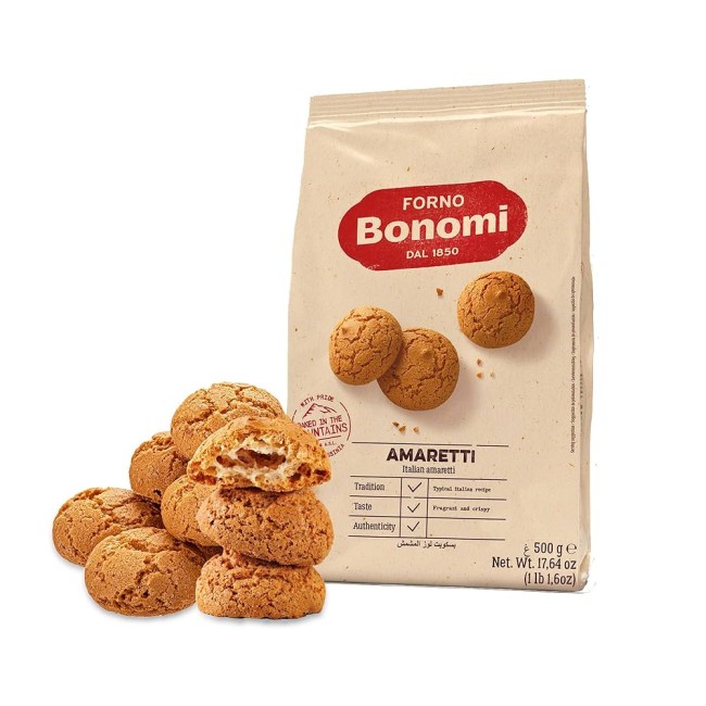 Bonomi Amaretti — традиционное итальянское миндальное печенье с характерным вкусом и лёгкой горчинкой ореха. Хрустящее снаружи и мягкое внутри.
