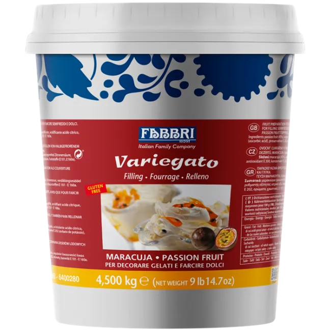 Продукт широко используется в кондитерском и ресторанном бизнесе: для прослаивания мороженого и джелато, приготовления йогуртов, муссов, кремов, тортов и пирожных. Благодаря густой текстуре и натуральному вкусу, Variegato Passion Fruit придаёт готовым изделиям выразительный внешний вид и освежающий аромат.