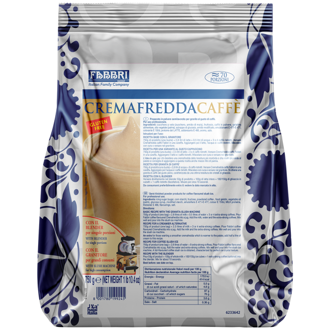 Fabbri Crema Fredda Coffee Powder 750g — профессиональный полуфабрикат для приготовления холодного кофейного крема, идеально подходящего для подачи в бокалах, десертных чашах или как основа для авторских рецептов. Продукт разработан для сегмента horeca и используется с граниторами или блендерами. Прост в приготовлении: достаточно добавить молоко, воду и эспрессо, чтобы получить насыщенный, бархатистый десерт с ярким кофейным вкусом. Формула обеспечивает стабильную текстуру и высокую рентабельность при использовании в кафе, барах и ресторанах.