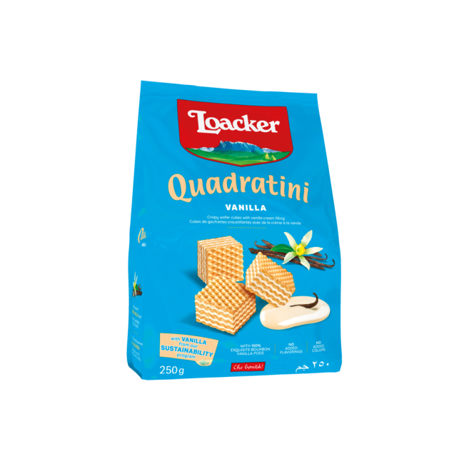 Loacker Quadratini Vanilla — это вафельные кубики с кремом из натуральной ванили Бурбон. Пять слоёв хрустящих вафель и четыре слоя ванильного крема создают утончённый вкус и аромат. Формат 125 г — идеален для лёгкого десерта или комплимента к напиткам.